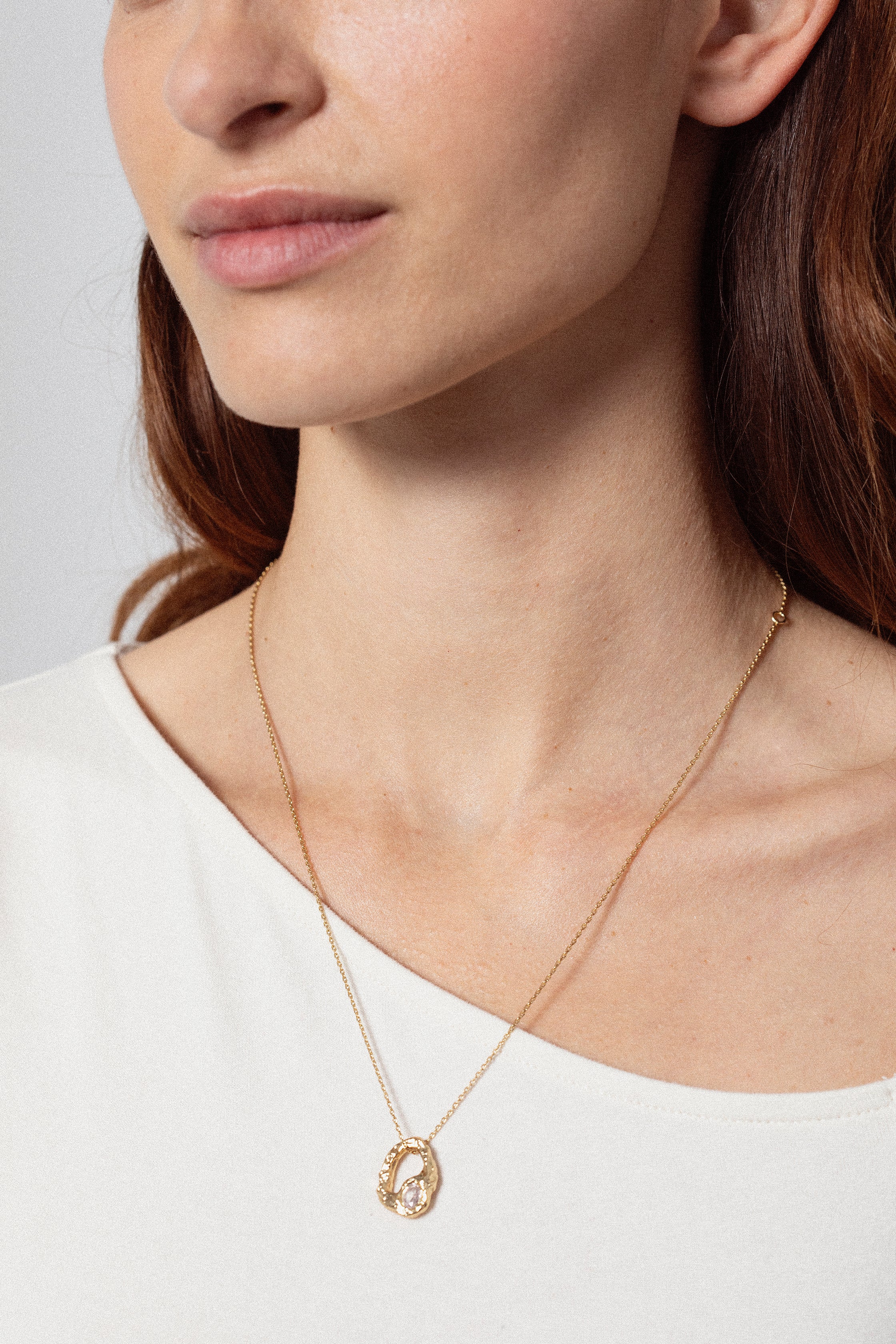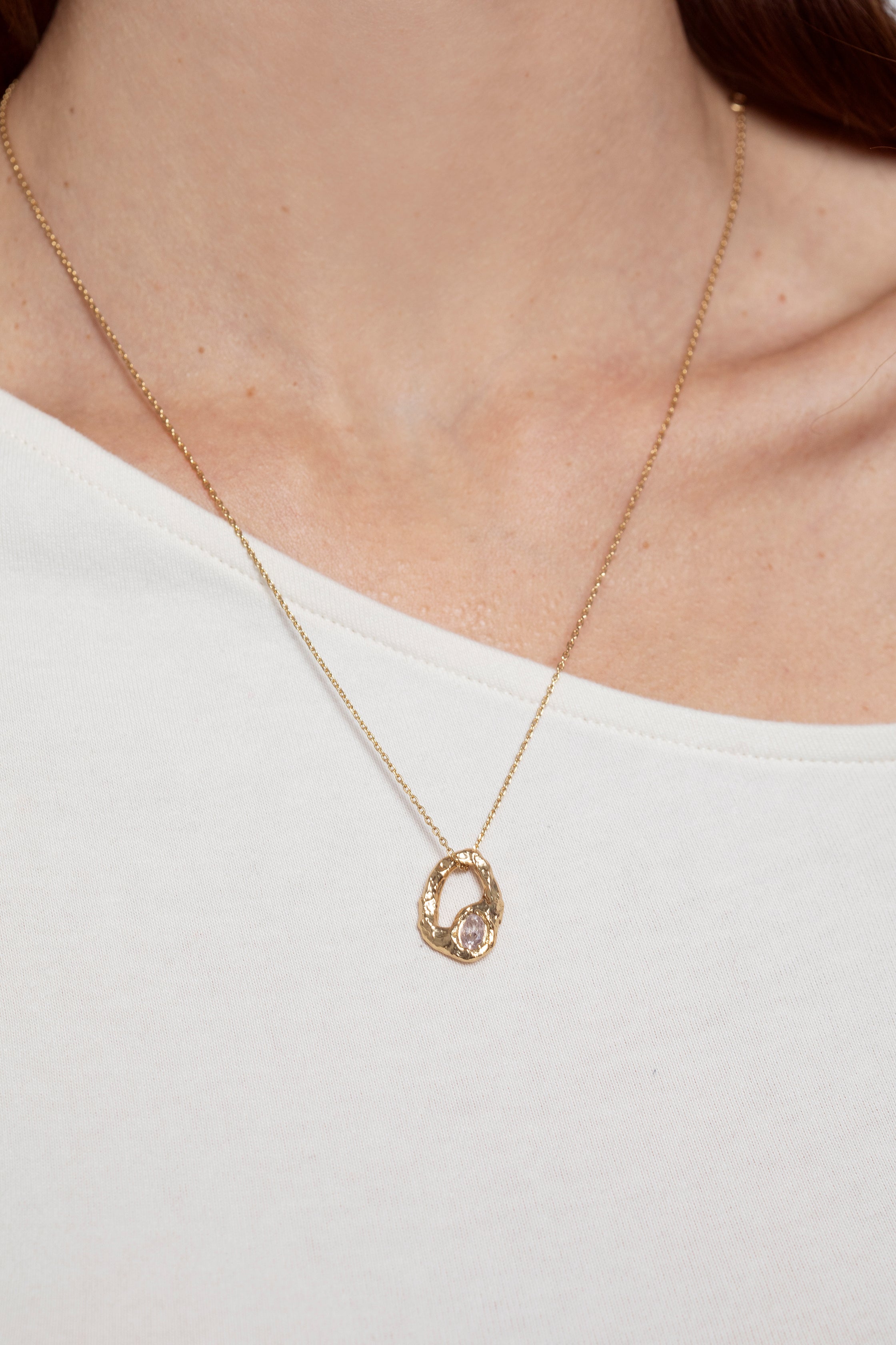 La estructura orgánica del metal sostiene y acompaña una piedra que simboliza la luna, invitándonos a reconectar con nuestros ritmos naturales. Es una expresión de amor propio, de confianza en uno mismo y de presencia.