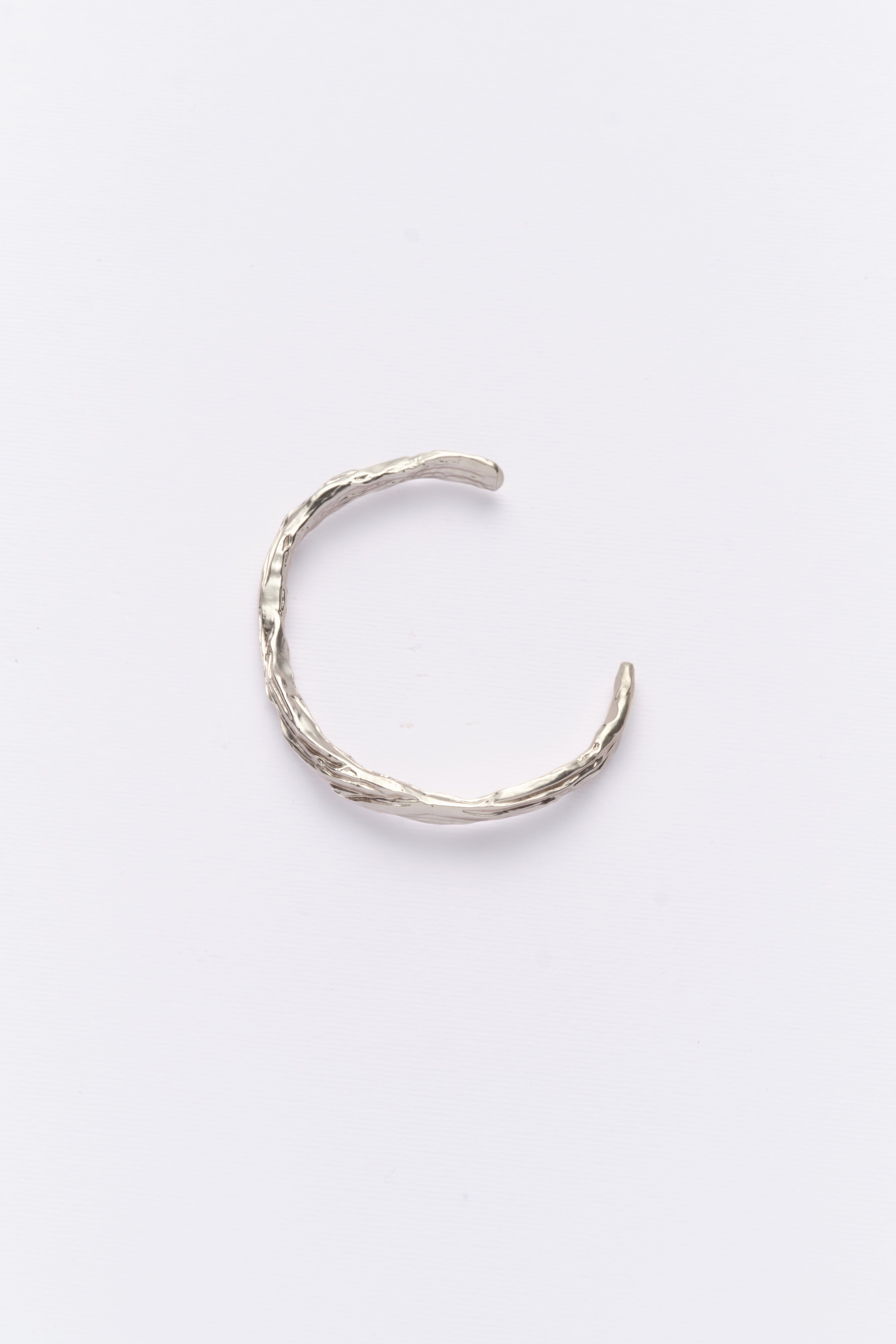 A fragment of terrain captured in metal, this cuff rests like a ridge across the wrist. Its textures echo the raw poetry of erosion, bold and grounded.