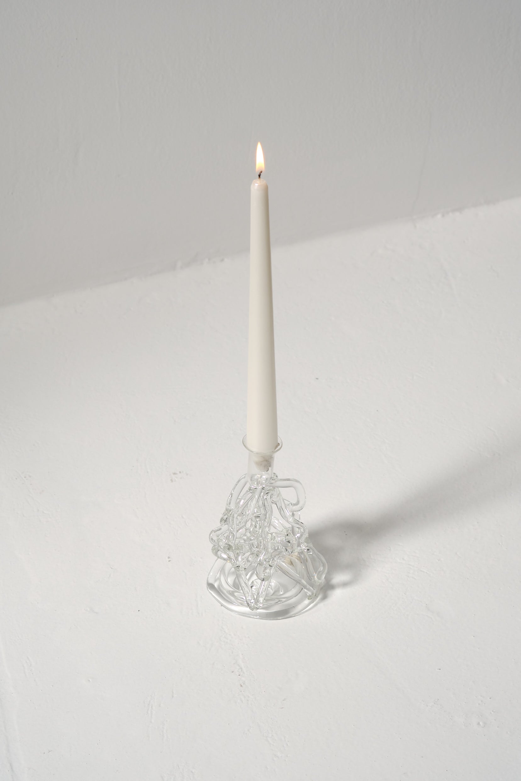 Description: Sculpted from glass to echo the movement of water, this candleholder captures the fluidity and grace of a gentle stream. Its organic form flows with undulating curves, like a river carving its path through time. As light flickers within, the glass reflects its glow, creating ripples of warmth that mimic the soft ebb and flow of water — a timeless dance between stillness and motion.